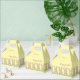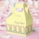 This adorable favor box is a pastel yellow. On the bottom there's arrow of brown Easter bunnies, each holding a colorful egg. The background color and text can be customized.
