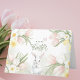 Easter folded greeting card featuring a watercolor floral border with pastel-colored pink tulips, yellow daffodils, daisies, and other spring flowers arranged at the corners. The center has the text "Happy Easter" in a graceful handwritten script font, with "Happy" in uppercase and "Easter" in a larger, flowing cursive style. A watercolor white bunny centered a bottom and a pink butterfly floating at center top. The background is a soft white with subtle watercolor-like green accents, enhancing the gentle and festive tone of the design. Floral images repeated on the inside top right and lower bottom left with customizable text - Warmest Wishes for a Joyful and Blessed Easter Holiday with space provided below for a signature.