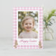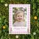 Celebrate Easter with a sweet and personal touch with this Happy Easter photo card, featuring a soft pink watercolor gingham design and adorable baby bunny accents. The front includes a large photo frame for your favorite picture, and the “Happy Easter” greeting and sender line are customizable, making it a lovely way to send a personalized Easter message to family and friends.