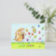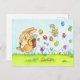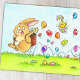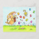 On this card, a beige easter bunny is hopping from right to left. He is carrying a basket on his back from which he takes easter eggs in all colors, that he drops into the grass as he passes by. From one of these eggs, a little chick is hatching mid-flight. It looks surprised and not too amused about the situation.