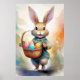 Poster of a cheerful rabbit in a blue outfit carrying a basket filled with colorful, decorated eggs. The background features soft floral details and gentle, warm colors.