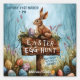Customize this EASTER EGG HUNT YARD SIGN featuring a large wooden sign with the words "EASTER EGG HUNT" painted on it in a rustic, handcrafted font. Perched on top of the sign is an adorable, fluffy brown rabbit with long ears, sitting next to a decorated Easter egg and spring flowers. Below the sign, numerous Easter eggs are scattered around the grassy ground. The eggs are intricately decorated with various patterns and colors. Easily personalize this yard sign with your particular EASTER EGG HUNT details. generativecontent