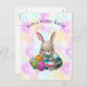Cute vintage Easter card. Cute little sitting brown bunny surrounded by brightly decorated Easter eggs. Background is pastel pink, yellow and turquoise. The words "Have a Happy Easter" can be changed
