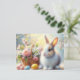 The design combines classic Easter imagery—painted eggs, fresh flowers, and a wicker basket—with a sweet rabbit portrait, creating a whimsical seasonal scene suitable for greetings, seasonal notes, or collectible spring stationery.