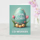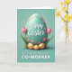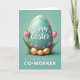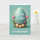 This greeting card features a large teal egg at the center, softly shaded with a matte look and wrapped in a spiral of tiny pink daisy-like flowers and slim green vines 🌷. Across the middle of the egg, “Happy Easter” appears in white flowing lettering, standing out clearly against the cool background. On each side, two pink tulip-shaped blooms rise with fresh green leaves, angled inward as if leaning close like friendly companions. Beneath the main egg sit three smaller smooth eggs in metallic gold, catching the light and adding a cozy, celebratory glow 🐰. The background stays a calm teal tone with gentle, diffused lighting that gives the shapes a lightly sculpted, three-dimensional feel. Along the bottom edge, the message “TO OUR WONDERFUL CO-WORKER” is set in bold white sans-serif text, centered and easy to read. The upward curl of the floral garland guides your eye from the lower left up toward the top of the egg, with the gold eggs aligned in a neat row below.