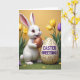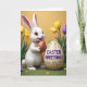 This design shows a small white bunny with a fluffy coat and reddish-orange eyes, standing slightly off-center and looking forward with a tender, friendly gaze 🐰. It holds a smooth brown egg close to its chest, as if sharing a secret gift with someone nearby. Next to it sits a much larger cream-colored egg covered in curling gold lines that loop across the surface like delicate ribbons. The words “EASTER GREETINGS” appear on the big egg in deep purple lettering, centered and easy to spot. Soft, bright light washes over the scene, warming the bunny’s fur and giving the eggs a gentle shine. A strip of green grass runs along the bottom with tiny yellow flowers, while yellow and purple blooms rise behind it like spring bouquets 🌷. In the background, a golden-yellow glow frames the flowers and eggs with a softly blurred garden look.