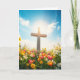 A wooden cross stands on a hill, surrounded by beautiful Spring flowers, backlit by sunlight on this exquisite Christian Easter card.