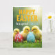 Designed with three fluffy yellow baby birds nestled in fresh green grass, this spring scene feels like a gentle moment of closeness, with the little trio leaning together as if sharing a secret 🐰. Two decorated oval eggs sit in front of them, and the birds peek over the top with soft, curious expressions that read like warm affection. The egg on the left is deep red with fine white floral patterns, while the egg on the right is teal with matching white botanical details. Across the upper area, the words “HAPPY EASTER” appear in rustic orange lettering, standing out clearly against the lighter background. Just below that, “to a special DAUGHTER” is written in white and pale blue, arranged as a secondary line that feels gentle and affectionate 🌷. The background fades into a softly blurred wash of spring greens and yellows, giving the foreground extra focus and a tender, cozy look. Fine white blossoms and leaf motifs curl across both eggs, with the teal egg slightly to the right and the red egg slightly to the left.