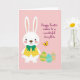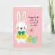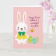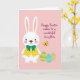 Designed with a soft pastel pink background, this card features a friendly white bunny on the left, with long ears shaded blush-pink inside and small rosy cheeks that give it a tender, affectionate look 🐰. The bunny has simple round black eyes and wears a sun-yellow vest with white polka dots plus a deep green bow tie, adding a sweet, dressy touch. On the right side, the message “Happy Easter wishes to a wonderful daughter” is arranged in several lines, written in magenta lettering that stands out clearly against the pink. A small yellow butterfly with an orange outline floats above the text, as if drawn toward the bunny’s gentle gaze 🌷. Near the bottom right, three decorated eggs sit together, suggesting a shared moment and quiet closeness in the scene. Each egg has its own pattern—stripes, zigzags, and dots—using green, aqua, and peach tones that feel light and springlike. The overall layout keeps the bunny facing toward the words, as though it’s offering the greeting directly. The eggs are clustered beneath the message, with the butterfly hovering just above the top line of text.