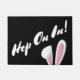 Black and white door mat with adorable white and pink bunny ears that reads "Hop On In!". Great seasonal addition to your front entryway or front porch decor.