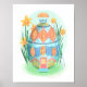 On top of a pastel-painted Easter egg, a tiny outdoor table setting sits two among the yellow daffodils. Original illustration by Noël Snow.