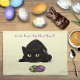 A cute black cat about to pounce on some Ukrainian Easter eggs in a backdrop of yellow
