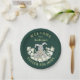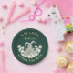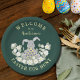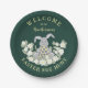 Create a warm first impression with these personalized Easter family welcome paper plates, perfect for an Easter brunch, egg hunt, or spring garden party. Featuring original artwork by Catherine Sweetman, the design showcases a cute Easter bunny holding a large yellow and purple polka-dot Easter egg, surrounded by spring foliage and daisies on a rich emerald green background.