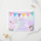 The cutest Easter Egg Hunt invitation postcard with a bird on a branch looking down on some Easter eggs and a cup of eggs and flowers on the side. A colorful banner flag makes the picture complete.