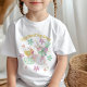 Adorable egg hunting crew T-shirt with hand painted bunny, chick, flowers, decorated eggs and carrots in pastel spring colors and patterns. Text can be easily edited or removed. Original art by Leslie Larson.