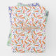 Wrapping paper sets of three sheets, perfect for Easter, with three patterns: carrots and purple flowers; colorful Easter eggs with a folk design, and lots of bunnies and chicks among tulips, Easter eggs, and Easter baskets.
