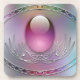 A pastel blue, lavender, and pink design with a translucent pink egg in a silver filigree setting, circled by a light silver oval frame set with four more smooth gems like colorful eggs.