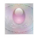 A pastel blue, lavender, and pink design with a translucent pink egg in a silver filigree setting, circled by a light silver oval frame set with four more smooth gems like colorful eggs.