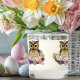 Cute brown Easter owl sitting in a nest of pastel coloured easter eggs and flowers against bright blue