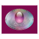 A pastel blue, lavender, and pink design with a translucent pink egg in a silver filigree setting, circled by a light silver oval frame set with four more smooth gems like colorful eggs.