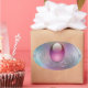 A pastel blue, lavender, and pink design with a translucent pink egg in a silver filigree setting, circled by a light silver oval frame set with four more smooth gems like colorful eggs.
