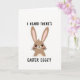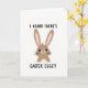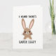 This card features a cute cartoon rabbit centered on a bright white background, with soft brown fur and long ears lined in pale pink 🐰. Its wide, dark eyes catch small white highlights, and the gentle blush on its cheeks gives it a shy, friendly look, like it’s leaning in to share a secret with someone close. A tiny heart-shaped nose and a few thin whiskers add to the tender expression, while a creamy patch on its chest suggests a plush, cuddly texture 🐇. Across the top, the text “I HEARD THERE’S” sits in rounded, uppercase letters in black, spaced evenly above the rabbit’s ears. Below the rabbit, “EASTER EGGS?!” appears in a smooth, flowing style in black, curving slightly to echo the character’s rounded shape. The simple layout leaves plenty of open space, making the rabbit and lettering feel like they’re having a sweet little back-and-forth. The final detail is the rabbit’s ears standing tall, with soft pink inner sections contrasting against the warm brown fur and the stark white background.