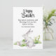 This custom greeting card features an elegant Easter theme. The bottom portion features a watercolor style image of a white rabbit hopping through the grass. Tulips are growing in the grass behind the white bunny, and two little decorated Easter eggs are placed in front of him. A "Happy Easter" greeting is printed at the top in an elegant script font, followed by a sample message and family name. You can personalize the greeting card to include your own custom name or other text.