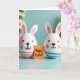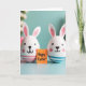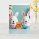 This design shows two egg-shaped bunny figures with smooth white surfaces, each with tiny black dot eyes, a small inverted triangle nose, and rosy pink cheeks that make them look gently fond of each other 🐰. Their long pointed ears rise up with soft pink inner details, adding a sweet, friendly look to the pair. Between them sits a small orange card with “Happy Easter!” centered in dark lettering, standing out against the lighter scene 🌷. One bunny has soft pastel pink stripes wrapping around its lower half, while the other wears matching stripes in a calm pastel blue. They rest on a flat aqua surface that blends into a softly blurred aqua background, keeping the focus on their close, side-by-side pose. In the distance, out-of-focus spring flowers in white and pale pink add a tender, romantic softness without distracting from the figures. Bright, even light smooths the textures and leaves only faint shadows under the bunnies and the orange card. Behind them, the background fades into gentle bokeh with pale blossoms clustered near the upper edges.