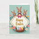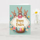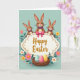 This card features a soft pastel spring illustration on a mint green background, with three brown, long-eared rabbits peeking in at the top as if sharing a friendly secret 🐰. Their wide smiles and rosy cheeks, along with small purple neckerchiefs, give the group a cozy, affectionate feel. The larger rabbit in the middle wears a pink bow and leans over an ornate, cloud-shaped cream frame trimmed in golden-brown lines and tiny dotted accents. Centered inside the frame, the words “Happy Easter” appear in shiny golden lettering, placed prominently across the middle. Below the greeting, a twig-woven basket holds three pastel eggs decorated with blue zigzags, pink stripes, and yellow crosses with wavy lines 🐇. Around the lower half, teal leaves and blossoms in soft pink, bright yellow, and white curl inward like a garden border. The frame’s scalloped edges and delicate trim sit just above the basket, with the rabbits’ paws resting along the top curve.