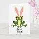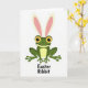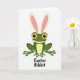 This design shows a friendly green amphibian centered on a bright white background, drawn with simple shapes and smooth edges. Its body is emerald green with a soft yellow belly, and small black speckles dot its arms, legs, and back. Two long bunny-like ears in pale cream with gentle pink inner shading sit on top of its head, adding a sweet, affectionate touch 🐰. The character looks straight ahead with golden-yellow eyes, dark pupils, and a tiny white highlight, as if meeting someone’s gaze with quiet fondness. A small curved smile lifts the face, suggesting an easy, companionable connection. Beneath the character, the words “Easter Ribbit” appear in thick, hand-drawn lettering, set in dark ink and centered under the illustration 🌷. The ears rise above the round head, with the pink inner sections tapering toward the tips against the white space.