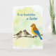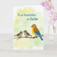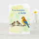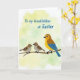 This design shows three stylized birds perched on a slender branch, arranged to draw your eye from left to right. Two smaller birds in soft brown and beige sit close together on the left, their bodies angled inward as if sharing a quiet moment like close friends. On the right, a larger bird stands slightly apart yet attentive, with a yellow-and-russet body and rich blue wings and tail that add a spring touch 🌷. The background is made of gentle watercolor-like washes in pale greens and light yellows, suggesting new leaves and filtered sunlight. The overall scene feels calm and affectionate through the birds’ relaxed posture and the way their heads subtly tilt toward one another. The message “To my Grandchildren at Easter” appears within the open space of the greenery in a calm blue, flowing style, centered so it doesn’t crowd the branch 🐇. Soft green and yellow washes fade toward the edges, while the branch runs horizontally with the bright blue feathers catching the light on the right.