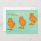 A vintage / antique Happy Easter postcard with three fuzzy yellow felt chicks all in a row. Background in green. Happy Easter!