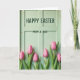 This design shows a pale mint-green wooden panel background with worn edges and small scuffs that give it a gently aged look. Centered in the upper half, the message “HAPPY EASTER MOM & DAD” appears in deep green, set in a simple sans-serif style that stands out against the light boards. The letters sit evenly with generous spacing, like a steady, caring note placed where your eyes land first. Soft, diffused lighting falls across the wood grain, making the texture feel touchable without harsh shadows. Along the bottom third, a horizontal row of pink flowers rises from the lower edge, their firm green stems leaning close together like a family huddle 🌷. The buds are tightly closed with delicate petal folds, suggesting a quiet closeness and affection in the way they cluster side by side 🐰. The pink blooms form a bright band against the cool green background, with the deepest pinks near the tips and lighter highlights along the curved petals.