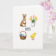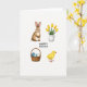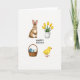This greeting card features a soft, watercolor-like illustration on a white background, arranged in a balanced grid that feels calm and open. Near the center, the words “HAPPY EASTER” sit as the main focus in dark lettering, with generous white space around them for an airy look. In the upper left, a gentle little bunny with long ears and dark eyes looks outward with a tender, friendly expression 🐰. In the upper right, a white pitcher holds a full bunch of golden, bell-shaped flowers with fresh green stems, like a thoughtful gift set out for someone special 🌷. Along the bottom left, a woven basket cradles three smooth eggs in soft pastel blue and white, their rounded shapes echoing the card’s quiet, affectionate mood. On the bottom right, a tiny yellow chick with rosy cheeks and a small orange beak stands alert, as if waiting to be noticed. The flowers show sunny yellow petals clustered tightly above the pitcher’s curved rim.