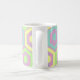 This mug has a geometric design of hexagons in pale blue, pale yellow, and pale green on a field of stripes in pale pink and pale purple.