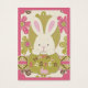 Easter Bunny peeking out from dot prints with floral print background.Easter gift tag.