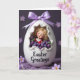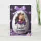 This design shows a smooth white egg shape with a cracked opening that reveals a tiny doll-like figure nestled inside, her golden curls framing closed eyes as if she’s resting close to someone dear 🐰. Around her, glossy deep-purple bead-like treats tumble in a gentle pile, with a few small green leaf accents that make the scene feel like a shared springtime gift. A soft lavender ribbon is tied at the top, its loops sitting neatly against the curved surface. The egg rests on textured lavender fabric, where out-of-focus pale purple floral shapes dot the background like distant blossoms 🌷. Near the lower front of the egg, the words “Easter Greetings” appear in black lettering, centered and easy to spot against the white. Behind everything, a rich purple backdrop fades darker toward the edges, drawing your eye back to the opening and the figure’s calm, affectionate pose. Light catches the ruffled edge of the cracked shell and glints off the purple spheres, making them look slick and candy-like. The palette stays mostly white, lavender, and deep purple, with the red outfit and white collar providing a small, cozy contrast.