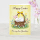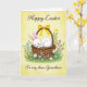 This card features a cozy brown wicker basket tied with a sunny yellow bow, set like a little nest in the middle of the scene. Curled inside is a small white bunny-like character 🐰, sleeping with long ears tipped in soft pink and cheeks lightly blushed, as if it’s resting after being watched over by someone dear. The basket sits on fresh green grass, where tiny wildflowers gather close around it the way friends might lean in for a quiet moment together. Blue, pink, purple, yellow, and white blooms spread across the lower edge, adding gentle color and a sense of springtime closeness 🌷. Behind everything, a warm yellow gradient fills the background like early morning light. The words “Happy Easter” appear at the top in flowing lettering, while “To my dear Grandson” is placed below in matching lettering, both in a darker tone that stands out against the pale background. Fine details show the basket’s woven texture, the bow’s smooth sheen, and the soft shading on the sleeping character’s face. Along the bottom border, the flowers vary in size and shape with small petals and thin stems layered over the grass.