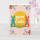 This greeting card features two stylized bunny figures facing forward on either side of a golden oval, their gentle expressions suggesting a sweet, friendly closeness 🐰. The left bunny is deep blue and holds a yellow egg with simple stripes, while the right bunny is warm coral and carries a blue striped egg 🐇. Between them, the words “Happy Easter” sit centered inside the oval in a darker, contrasting color that stands out clearly. Behind the pair, rolling green hills curve across the lower half, dotted with small flowers in red, orange, and white. The background is a soft blush pink, sprinkled with little botanical accents so the scene feels like a garden in early spring. Crimson flower shapes and teal leaves are scattered around the edges, framing the characters and keeping the focus on the middle. The golden oval has a smooth border, and the hills and blossoms sit neatly beneath it in simple, outlined shapes.