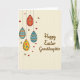 This card features four decorated egg shapes hanging down the left side on dotted strings, creating a sweet, festive scene 🐰. One egg is deep red with small golden floral details, another is teal with red stripes and tiny stars, a third is dark blue with white flower shapes and golden zigzag bands, and the last is sunny yellow with red and blue starbursts. The background is a soft cream tone with faint vertical stripes, giving the colors room to stand out without feeling busy. Small red hearts drift around the eggs, and a few tiny butterflies with golden wings float nearby, like they’re circling a gentle bond between giver and receiver 🌷. On the right side, the greeting “Happy Easter Granddaughter” appears in flowing brown lettering, taking up most of the open space. The text sits centered on the right half, with the words stacked neatly so they feel close and affectionate next to the hanging eggs. The hearts and butterflies are scattered mostly between the eggs and the message, with a few tucked near the top and middle of the design.