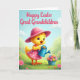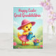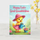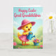 This card features a bright digital illustration of a young, feathered chick character in a spring meadow, with a gentle smile that suggests caring friendship. Across the top, fuchsia text reads “Happy Easter Great Grandchildren,” standing out clearly against the sky. The character is sunny yellow and wears a wide pink sun hat plus a matching pink dress with small dot patterns, adding a sweet, dressed-up look. In its wings, it holds a small teal-blue watering can, angled carefully as if tending something special for someone close 🐰. Below, a blue flower pot is filled with blossoms in pink, yellow, and blue, arranged like a little garden gift. The setting includes rich green grass, scattered wildflowers, and a light blue sky with soft clouds, giving the scene a calm, springtime feel 🌷. In the background, slightly softened green foliage frames the chick as a thin stream of water pours from the teal can into the colorful flowers.
