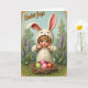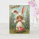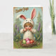 This greeting card features a sweet childlike figure in the center, dressed in an ivory bunny suit with rose-tinted inner ears and a fluffy tail 🐰. Golden curls peek out around bright green eyes and rosy cheeks, and the small hands are gently clasped as if holding back a shy smile meant for someone close. The character stands in fresh green grass, with tall stems of lavender-purple flowers rising on both sides like a soft floral curtain 🌷. Near the feet, a rustic woven nest holds three glossy eggs in leafy green, pale pink, and warm coral, adding a tender “shared surprise” feel to the scene. Behind it all, a pale blue sky fades into softly blurred evergreen shapes, keeping the focus on the figure’s gentle expression. Along the top edge, the words “Easter Joys” appear in ornate dark lettering, centered above the illustration. A faded, old-fashioned border surrounds the artwork with lightly worn edges and muted tones.