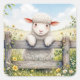 A fluffy lamb leans on a wooden fence surrounded by colorful wildflowers under a bright blue sky