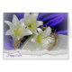 White Easter lilies on crown of thorns and Bible with purple satin background and torn edge border.