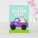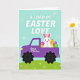 This card features a stylized purple pickup truck rolling over a gentle green hill beneath a light blue sky, with a sweet springtime mood 🌷. In the open truck bed, a white rabbit with long ears lined in pink sits close beside a small yellow chick, their relaxed posture suggesting an easy bond 🐇. Around them, several decorated ovoid eggs in bright colors are tucked in like a shared gift, each marked with tiny floral and geometric motifs. Across the top, large white letters with a soft shadow spell out “A LOAD OF EASTER LOVE,” centered against the sky. On the side of the truck, the smaller phrase “Great Grandson” appears as a neat label in a light tone that stands out from the purple body. Pink and orange heart shapes drift across both the sky and the grassy slope, echoing the tender closeness between the two animals. The truck has chunky black wheels and simple graphic shading, and the eggs sit clustered behind the rabbit and chick in the open bed.