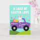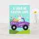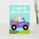 Designed with a sweet spring scene, this card features a white rabbit character driving a stylized purple pickup truck across rolling green hills under a pale aqua sky 🐰. Small heart shapes drift around the scene, adding a gentle, affectionate mood, as if the driver is delivering a caring surprise to someone special. At the top, the phrase “A LOAD OF EASTER LOVE” appears in large uppercase letters, set in a light-toned color that stands out clearly against the sky. On the side of the truck, the words “Great Grandson” are printed in a contrasting light color, placed like a label on the door panel. In the truck bed, a smaller pink rabbit relaxes among decorated eggs, with patterns like stripes and dots in blues, yellows, and reds 🐇. A few tiny hearts also decorate the truck body, tying the message to the imagery without crowding the layout. The background stays simple with soft clouds of color, and the green hills form a smooth band along the bottom edge.