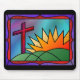 A stained-glass design illustrating Easter morning, with a red cross standing on green hills beside a fiery sunrise.