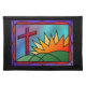 A stained-glass design illustrating Easter morning, with a red cross standing on green hills beside a fiery sunrise.