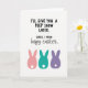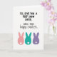 This card features a cheeky Easter message centered on a bright white background, mixing flirty humor with a quick, bashful correction 🐰. The top line sits in large, dark lettering and reads “I’LL GIVE YOU A PEEP SHOW LATER,” giving the page a daring, teasing start. Just below it, a smaller all-caps “SORRY, I MEAN,” appears like a sudden pause, as if the writer caught themselves mid-thought. Under that, “happy easter” is written in a looser, flowing style, softening the tone like a gentle smile shared between friends. The stacked text stays neatly centered, leaving plenty of open space that makes the joke feel even more pointed. Beneath the words are three simple bunny shapes 🐇 in pastel pink, teal, and lavender, adding a sweet counterbalance to the saucy line above. Each bunny is turned away, which makes the scene feel a bit coy, like they’re in on the joke together. A tiny white circle sits at the base of each bunny as a fluffy tail against the colored silhouettes.