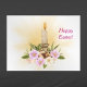 Easter Christian Holiday Card. Pink flowers with a candle and hot cross buns.